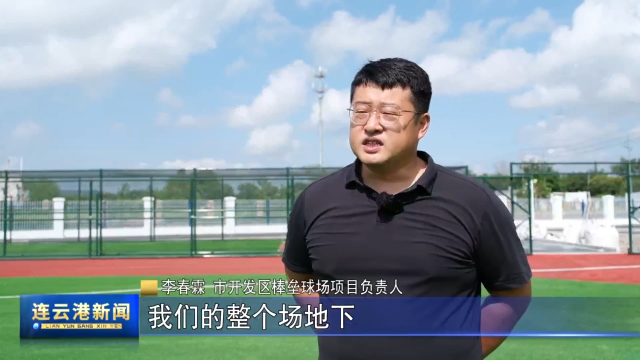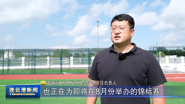 【同期声】连云港开发区棒垒球场项目负责人 李春霖:项目按照赛事标准实施人造草坪、红土、围网和防撞垫等场地设施,采购和安装赛事照明设备、音响系统、电子大屏、看台等配套设施,项目于今年2月份完成土地划拨、建设工程规划许可证、施工图审查等各项前期手续办理,3月31日进场施工,6月30日完工。目前,项目主体已完工,正在进行绿化施工,也正在为即将在8月份举办的锦标赛开展各项赛前筹备工作。