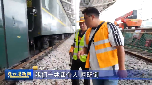 上水工 梁海军:我们一共四个人,两班倒,上48小时,歇48小时。我们一天要加9趟列车,一趟列车是550米。每天要走将近15公里。