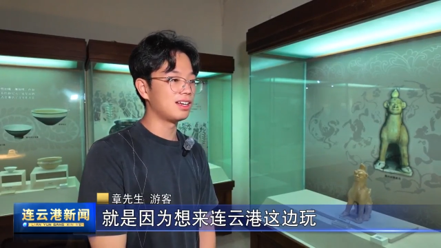 游客 章先生:我是从浙江过来的,就是因为想来连云港这边玩,然后了解一座城市,是不是就应该先从它的博物馆开始,了解它的一个城市底蕴,然后主要过来看还是因为它这边有一个镇墓兽(接)然后我觉得它很像一个网红,所以还是特地过来看了一下。