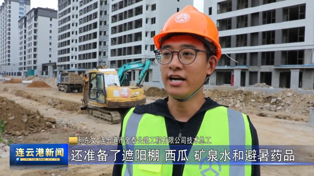 孙东文 连云港市金泰公路工程有限公司 技术总工:我们安排工人轮岗工作,适时安排休息,还准备了遮阳棚,西瓜、矿泉水,避暑药品,实时对工人实施健康检查,确保安全生产工作有序进行。