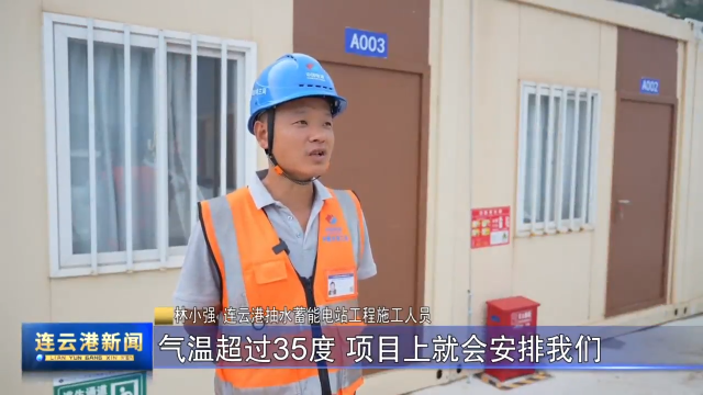 林小强 连云港抽水蓄能电站工程施工人员:气温超过35度,项目上就会安排我们中午11点到下午3点之间休息,这样上班时间也缩短了,我们有足够的休息时间,包括现场还会配备一些防暑降温的药品,还有一些绿豆汤、西瓜、盐汽水、矿泉水之类的这些东西。