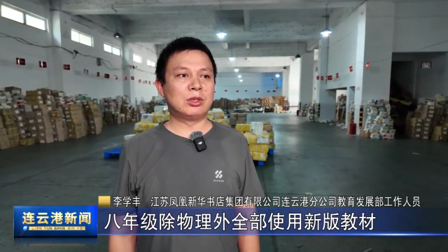 江苏凤凰新华书店集团有限公司连云港分公司教育发展部工作人员 李学丰:新学期二、三年级除英语外全部使用新版教材,四年级英语使用新版教材,八年级除物理外全部使用新版教材,九年级物理、艺术戏剧、艺术舞蹈、艺术影视也使用新版教材。
