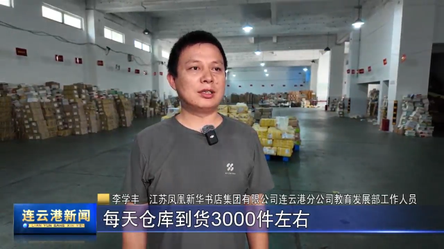 江苏凤凰新华书店集团有限公司连云港分公司教育发展部工作人员 李学丰:目前,各科教材正在陆续到货,每天仓库到货3000件左右,当天所到书籍要全部分发完毕。现在已经配送教材70%。