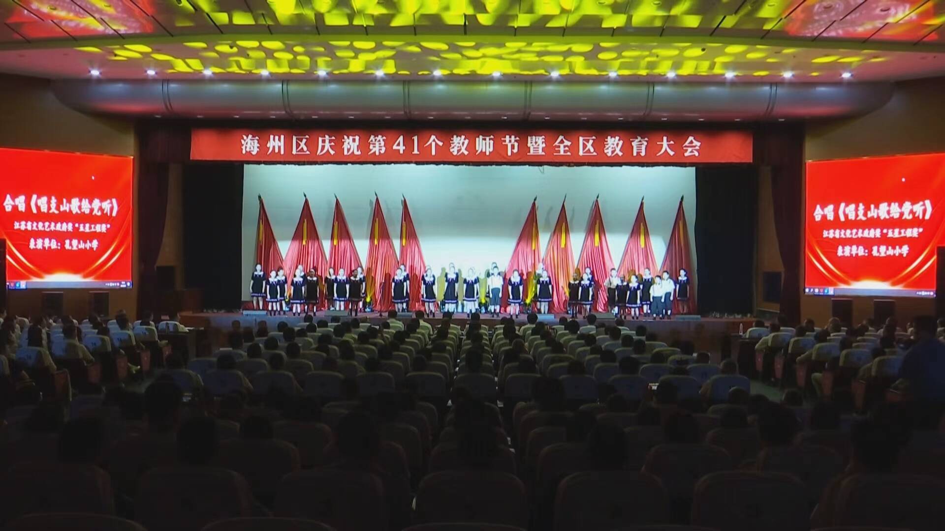 海州区举行庆祝第41个教师节暨全区教育大会,活动在连云港市孔望山小学孩子们纯净而深情的合唱《唱支山歌给党听》中开始,清脆的歌声唱出了对党的无限热爱与感激之情;由海州区音乐教师代表带来的器乐合奏《奇迹》,旋律激昂奋进,技艺娴熟精湛,充分展现了全区艺术教师队伍卓越的专业素养和追求卓越的精神风貌;诗朗诵《教师礼赞》铿锵有力又饱含深情的语言,诉说了教书育人的甘苦与荣光,表达了对教育事业的无限忠诚与热爱;群舞《在灿烂的阳光下》用活泼优美的舞姿,生动展现了在党的阳光雨露滋润下健康快乐成长的幸福图景,寓意着海州教育事业蓬勃发展的美好未来。节目以艺术的形式诠释了人民教师俯首甘为孺子牛,照亮学生前行之路的无私奉献精神。