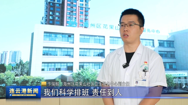 海州区花果山社区卫生服务中心副主任 卞瑞麟:为确保国庆中秋长假期间医疗卫生服务不断档,我们制定了周密的轮班值守方案。按照应急、医疗、疾控等不同科室的职能要求,我们科学排班、责任到人,确保24小时都有人在岗响应。