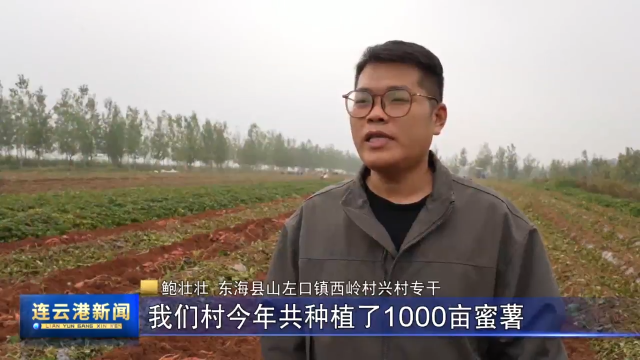 东海县山左口镇西岭村兴村专干 鲍壮壮:我们村今年共种植了1000亩蜜薯,经过精心培育,每亩产量能达到5000斤左右。