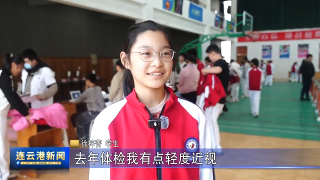 连云港市新海实验中学体育教师 王颖龙:我们学校一直以来重视学生的体质健康发展。一方面定期配合省、市开展学生的视力筛查、体力健康检查。主要包括了基本视力筛查还有屈光度检查。(接)此外,我们学校还积极落实(“2·15专项行动”),保证每天室外运动两小时,课间15分钟。