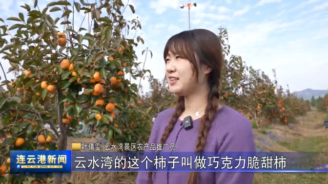 云水湾景区农产品推广员 叶倩雯:咱们云水湾的柿子叫做巧克力脆甜柿,它是一个比较甜的品种,皮比较薄,它里面是有一点黑色的纹理,所以叫做巧克力脆柿,吃起来是比较甜的。