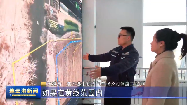王维浩 连云港中新燃气有限公司调度工程师:它就自己飞了,它就会按照既定的航线,就是岗埠高压管道这一段,从浦南一直到平明,总长大约14公里。如果在黄线范围内出现了挖机机械设备之类的,它就会实时出现一个报警,用一个红框把它框起来。推送到我们系统,我们会派现场的人去核实。