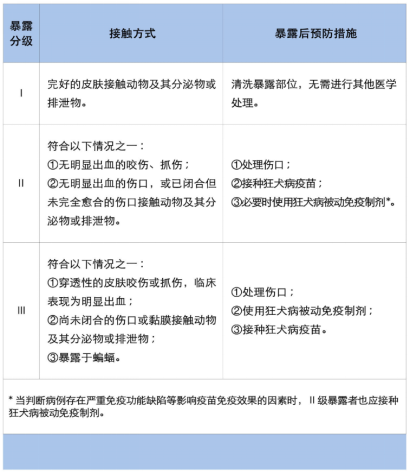 答:首先我们先了解下,什么是“狂犬病暴露”?“狂犬病暴露”指被狂犬、疑似狂犬或不能确定健康的狂犬病宿主动物咬伤、抓伤、舔舐粘膜或破损皮肤处,以及开放性伤口、粘膜接触可能感染狂犬病病毒的动物唾液或组织。接触或者喂饲动物,或者完好的皮肤被舔舐为I级暴露。裸露的皮肤被轻咬,或者无明显出血的轻微抓伤、擦伤为Ⅱ级暴露。单处或者多处贯穿性皮肤咬伤或者抓伤,或者破损皮肤被舔舐,或者开放性伤口、黏膜被唾液或者组织污染,或者直接接触蝙蝠为Ⅲ级暴露。所以不仅是咬伤,只要“暴露”于以下动物,都需要尽快打狂犬疫苗:犬是我国狂犬病的主要传染源,占95%以上,其次是猫。野生或流浪的食肉哺乳动物传播风险高,鼬、獾、狐狸、貉(he)、狼是我国重要的野生动物传染源。蝙蝠是传播狂犬病的高风险动物。当然,大家不用过度紧张,并不是所有动物都会传播狂犬病。如果是被以下这些动物咬伤,通常无需接种狂犬病疫苗:被牛、羊、马、猪等家畜和兔、鼠等啮齿动物咬伤,感染狂犬病毒的风险低,通常无需打狂犬疫苗。禽类、鱼类、昆虫、蜥蜴、龟、蛇等动物,不感染和传播狂犬病病毒,被咬伤后不需要打狂犬疫苗。被人咬伤或抓伤,无需担心感染狂犬病病毒,更无需接种狂犬病疫苗。不管被什么样的动物咬伤,及时处理伤口都是非常重要的操作。最后,要强调的是狂犬病可防不可治,致死率几乎为100%,千万不要侥幸,以免酿成悲剧。答:狂犬病的传播途径主要是直接接触传播,体现在以下五个方面:1.咬伤传播:这是狂犬病最主要的传播方式。当被携带狂犬病毒的动物(如狗、猫、狼、蝙蝠等)咬伤后,病毒会通过伤口进入人体。这些病毒会在伤口附近的肌肉细胞中复制,并随后侵入神经末梢,进而从周围神经沿神经轴突向中枢神经系统侵蚀。2.抓伤传播:虽然相对少见,但如果被携带病毒的动物抓伤,尤其是当抓伤导致皮肤破损时,也存在感染狂犬病的风险。3.黏膜感染:如果人的口腔、眼结膜等黏膜部位被狂犬病毒污染,例如被患病动物的唾液污染,也有可能引起感染,但这种情况相对较少见。4.器官移植:理论上,如果移植了来自狂犬病死亡病例的器官,也有可能传播狂犬病。然而,在实际情况中,由于严格的器官移植前检测和筛选程序,这种情况几乎不会发生。5.宰杀病犬、剥皮、切割等过程中被感染:在处理患病动物时,如果不注意个人防护,病毒有可能通过皮肤破损处进入人体。答:狂犬疫苗和免疫球蛋白的接种,是根据“狂犬病暴露”分级来确定的,根据国家颁布的《狂犬病暴露预防处置工作规范(2023年版)》,暴露分为三个等级:一级暴露是指……,暴露后清洗暴露部位,无需接种疫苗和球蛋白;二级暴露是指……,暴露后及时处理伤口,及时接种狂犬疫苗(免疫功能缺陷者等异常情况建议同时接种免疫球蛋白);三级暴露是指……,暴露后及时处理伤口+接种狂犬疫苗+接种免疫球蛋白。