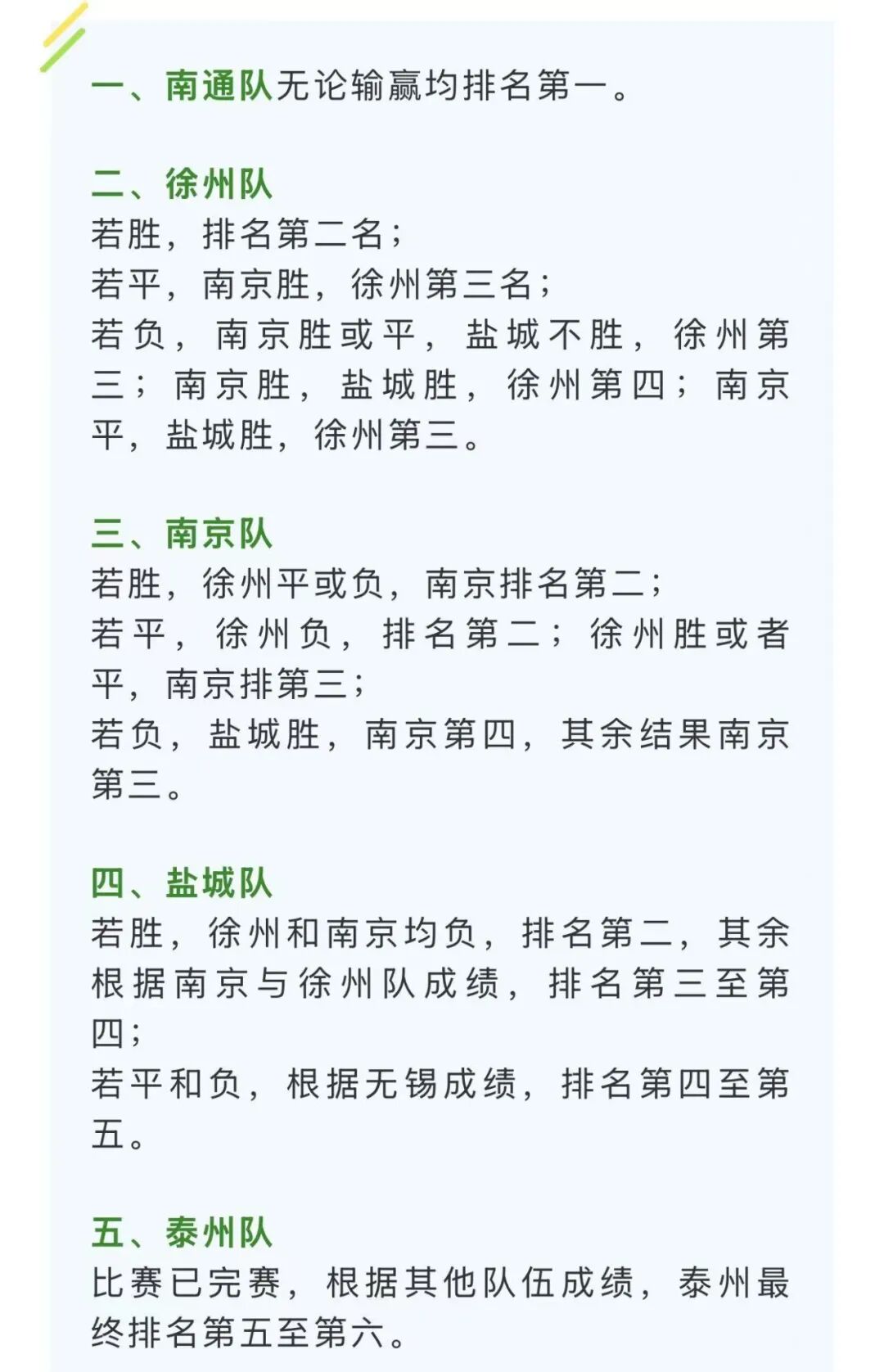 本周六,“苏超”将迎来最后一轮常规赛,晋级悬念即将迎来终极揭晓。目前,南通、徐州、南京、盐城已提前锁定淘汰赛门票,而泰州、无锡、宿迁、连云港、淮安五队将为剩余四个八强席位展开激烈厮杀。究竟哪些队伍能突出重围,最终跻身八强?