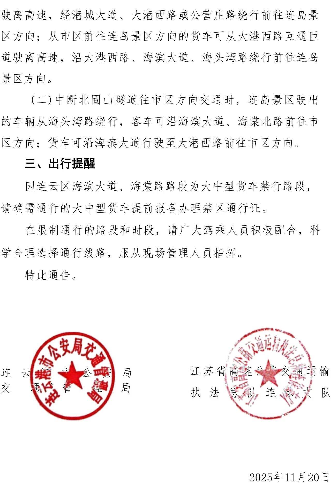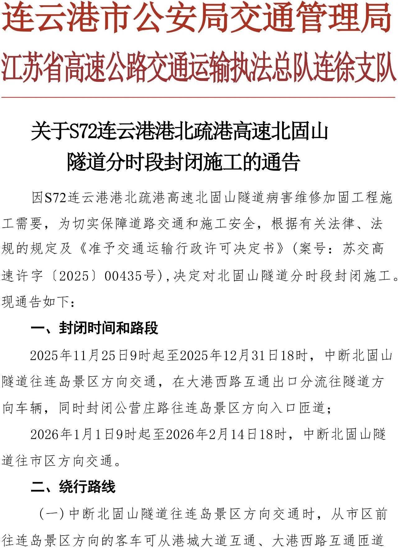 关于S72连云港港北疏港高速北固山隧道分时段封闭施工的通告
