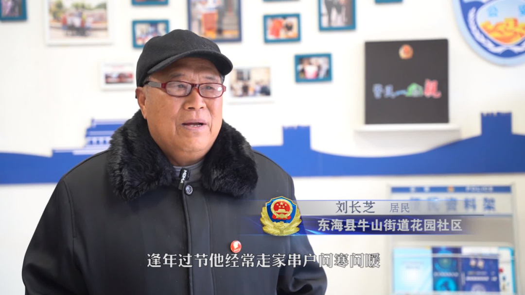 东海县牛山街道花园社区 居民 刘长芝:张英龙同志非常关心照顾我们这些老年人,逢年过节他经常走家串户问寒问暖,重阳节那天我正要出门,听见敲门声,出来一看,发现张英龙带着干警捧着饺子送上门来,我很感动。还有几次,他晚上十点多钟带着干警骑着电动车在小区巡逻,得到大家好评,很多时候业主说了,这才是真正的社区保护神。