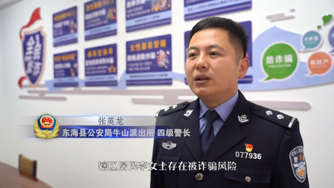 东海县公安局牛山派出所基础工作中队副中队长 张英龙:一天晚上,我们接到后台推送的预警指令,辖区居民李女士存在被诈骗风险。我们随即联系李女士结果电话却始终占线,于是我们第一时间赶赴李女士的家中,表明身份进门后我们发现李女士正在和冒充抖音客服的工作人员打电话聊天,我立即接过电话核实对方的信息,眼看事情败露骗子随即挂掉了电话,让李女士顺利逃脱骗子所布置的“陷阱”。