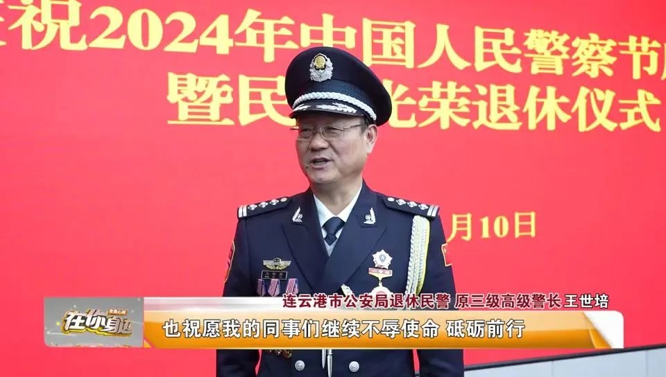 连云港市公安局退休民警 原三级高级警长 王世培:参加今天这个活动我感慨良多,从警43年时间流逝的是年华,积累的是经验,升华的是人生,然而始终不变的是我对人民警察这份职业饱含的深情挚爱,对人民警察这份职业无怨无悔的奉献,能在人民警察节这么一个有意义的日子退休,是我的荣幸,也祝愿我的同事们继续不辱使命,砥砺前行,在平凡的岗位上做出不平凡的业绩。