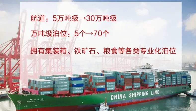 连云港港口航道由5万吨级浚深至30万吨级;万吨级泊位从5个增加到70个,最高为30万吨级;拥有集装箱、铁矿石、粮食等各类专业化泊位。