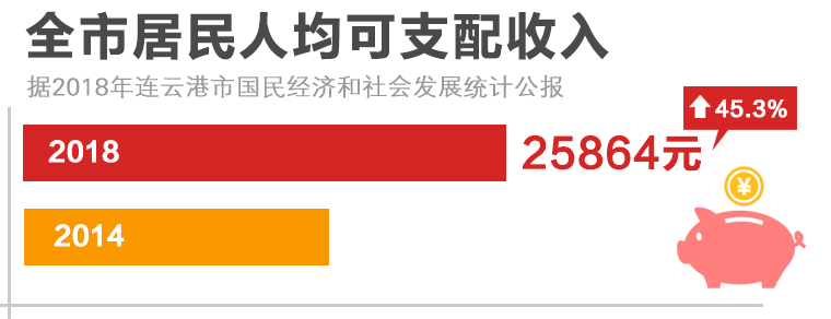 据连云港市国民经济和社会发展统计公报,2018年全市居民人均可支配收入25864元,较2014年增长45.3%。其中,城镇常住居民人均可支配收入32749元;农村常住居民人均可支配收入16607元。