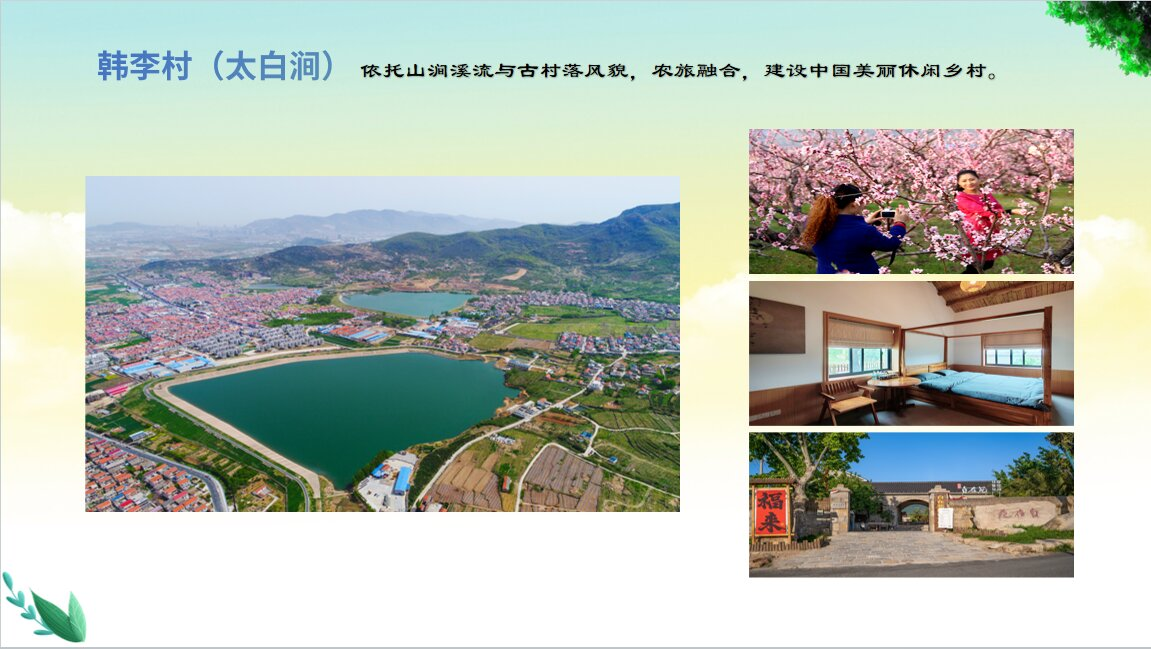 韩李村(太白涧),依托山涧溪流与古村落风貌,发展民宿与农家乐,春季桃花漫山,秋季红叶似火,四季景致各异。