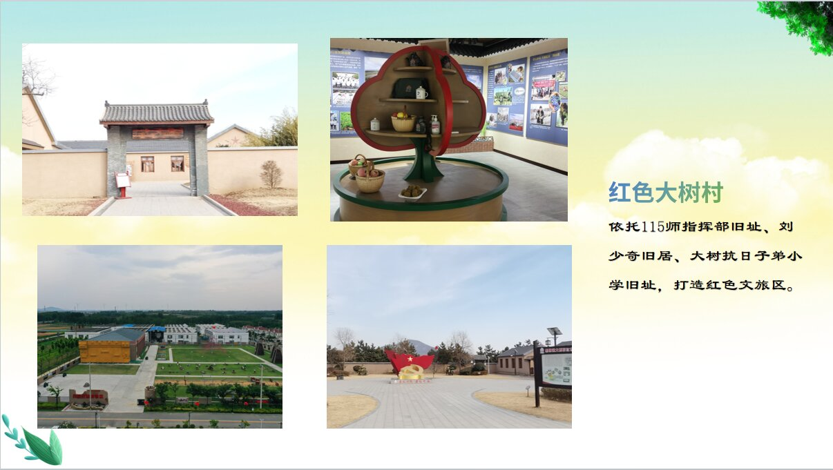 红色大树村,依托115师指挥部旧址、刘少奇旧居、大树抗日子弟小学旧址,打造出红色主题民宿、红色大树广场、红色主题餐厅等红色文旅区。