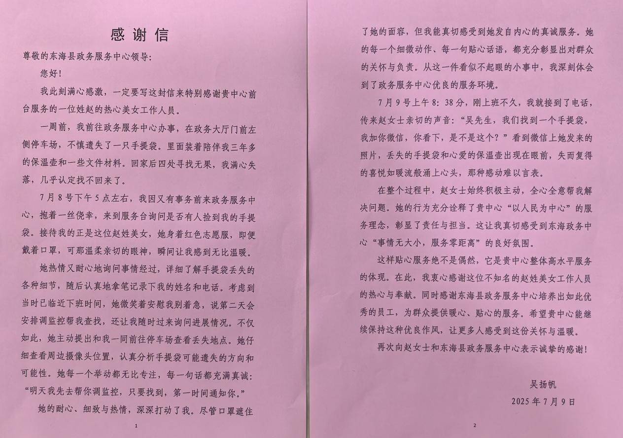 在整个过程中,赵女士始终积极主动,全心全意地为吴先生解决问题。她的行为不仅让吴先生深受感动,更充分诠释了东海县政务服务中心“以人民为中心”的服务理念,彰显了责任与担当,让群众真切感受到了“事情无大小,服务零距离”的良好氛围,吴先生还亲自写了一封感谢信送过去,后来他才得知这位工作人员叫赵平。