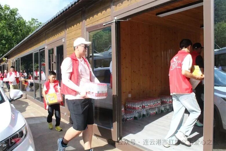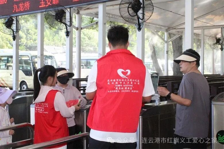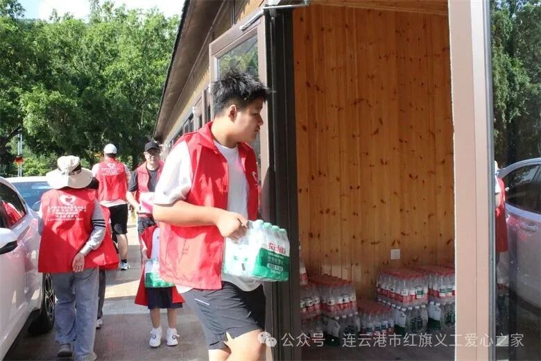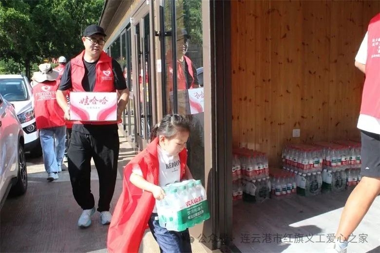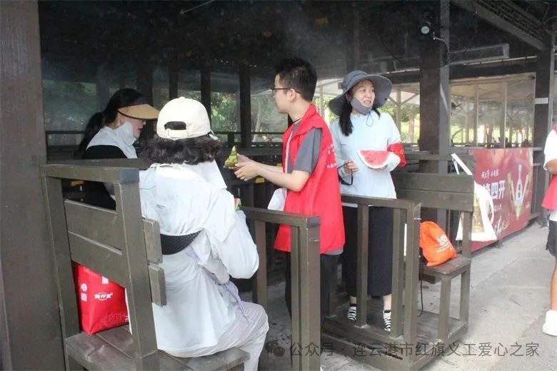 在活动现场,志愿者家庭、爱心人士一起为花果山旅游的票务人员、检票人员、环卫人员等一线人员送去了矿泉水、冰红茶、西瓜等近三千余元的清凉物资。